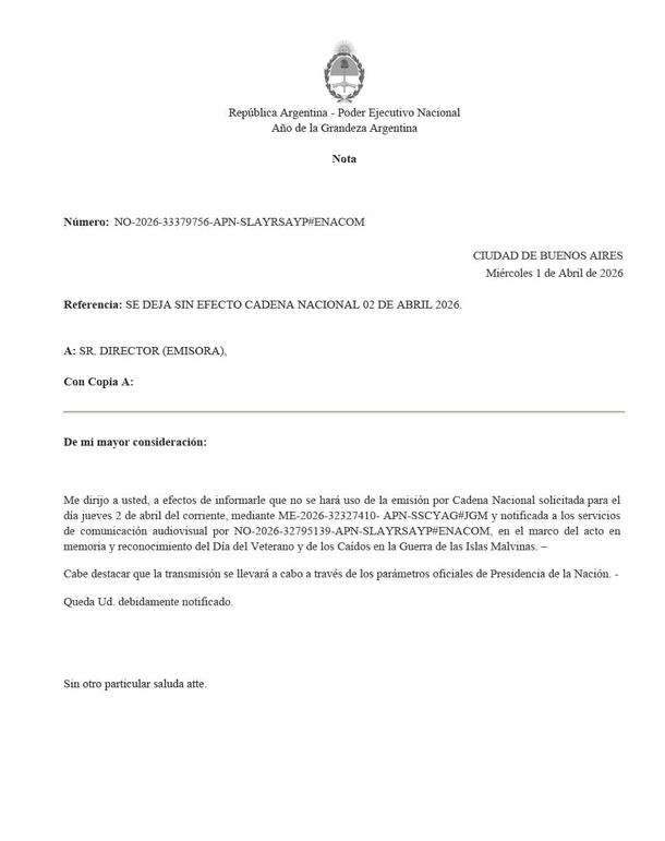 A través de un comunicado, el Gobierno de Javier Milei informó que "no se hará uso de la emisión por cadena nacional solicitada para el jueves 2 de abril en el marco del acto en memoria y reconocimiento del Día del Veterano y de los Caídos en la guerra de las Islas Malvinas".