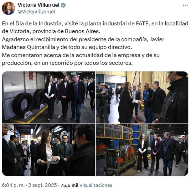 La vicepresidenta usó sus redes sociales para contar su actividad, mientras el escándalo de los hermanos Milei estalla por todos lados: "En el Día de la Industria, visité la planta industrial de FATE, en la localidad de Victoria, provincia de Buenos Aires. Agradezco el recibimiento del presidente de la compañía, Javier Madanes Quintanilla y de todo su equipo directivo. Me comentaron acerca de la actualidad de la empresa y de su producción, en un recorrido por todos los sectores".