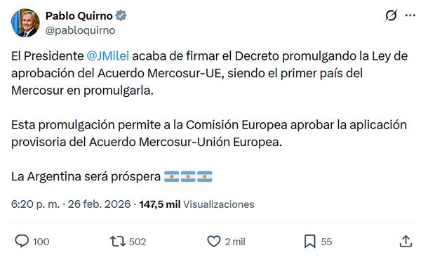 Así lo informó el canciller Pablo Quirno mediante una publicación en redes sociales: “El Presidente Javier Milei acaba de firmar el Decreto promulgando la Ley de aprobación del Acuerdo Mercosur-UE, siendo el primer país del Mercosur en promulgarla”.