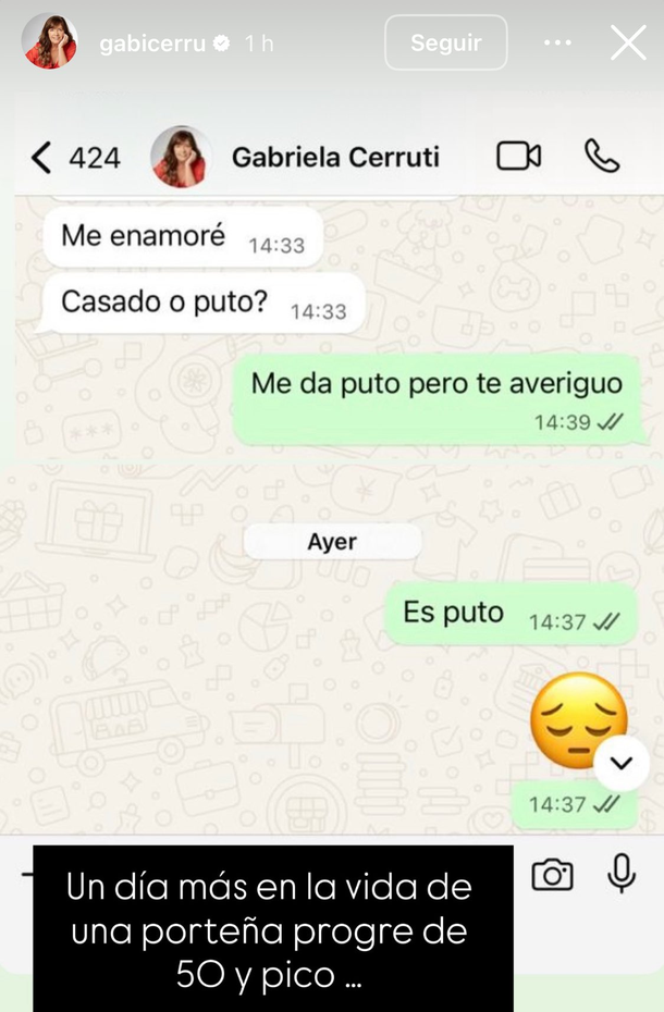 El insólito chat privado y con final inesperado que publicó Gabriela Cerruti: "Me enamoré..."