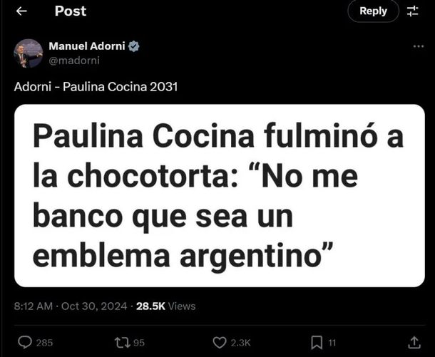 Adorni no dudó en apoyarla. Publicó una imagen del recorte de sus dichos y comentó su deseo de conformar una fórmula electoral con la cocinera: "Adorni- Paulina Cocina 2031".