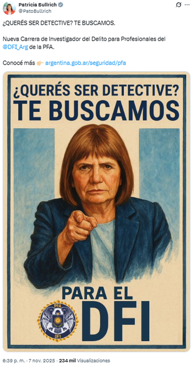 Con una imagen idéntica al "tío Sam" de Estados Unidos, la ministra de Seguridad escribió: "¿Quéres ser detective? Te buscamos. Nueva carrera de Investigador del Delito para Profesionales del @DFI_Arg de la PFA", informó, sorprendiendo mucho más con la imagen que con el mensaje.