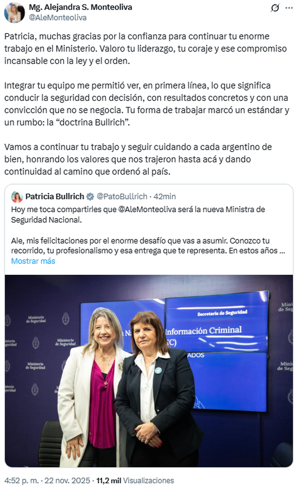En un reciente posteo donde responde a palabras de la todavía ministra de Seguridad, Monteoliva señaló: "Patricia, muchas gracias por la confianza para continuar tu enorme trabajo en el Ministerio. Valoro tu liderazgo, tu coraje y ese compromiso incansable con la ley y el orden".