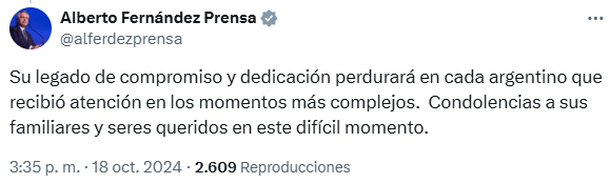 Para concluir, Fernández expresó que el "legado de compromiso y dedicación" del exfuncionario "perdurará en cada argentino que recibió atención en los momentos más complejos. Condolencias a sus familiares y seres queridos en este difícil momento".