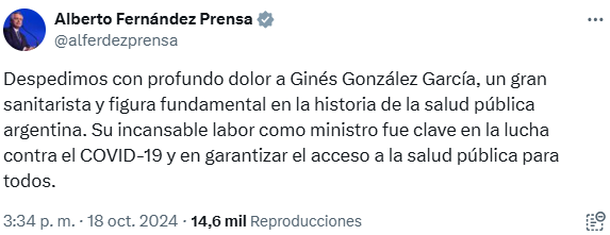 "Despedimos con profundo dolor a Ginés González García, un gran sanitarista y figura fundamental en la historia de la salud pública argentina. Su incansable labor como ministro fue clave en la lucha contra el Covid-19 y en garantizar el acceso a la salud pública para todos", añadió.