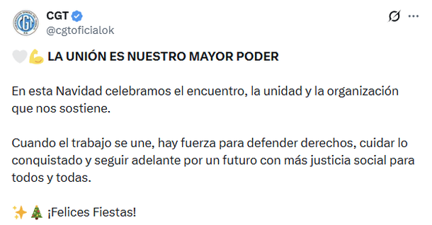 “La unión es nuestro mayor poder”, rezael título de la publicación realizada por la cuenta oficial de la CGT en su perfil de la red social X.
