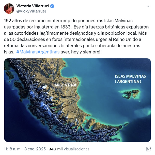 La vicepresidente Victoria Villarruel publicó un mensaje este viernes al cumplirse 192 años de la ocupación ilegal de las Islas Malvinas por parte de fuerzas británicas. Su comunicado personal se suma al emitido por el que publicó más temprano Cancillería, a cargo de Gerardo Werthein.