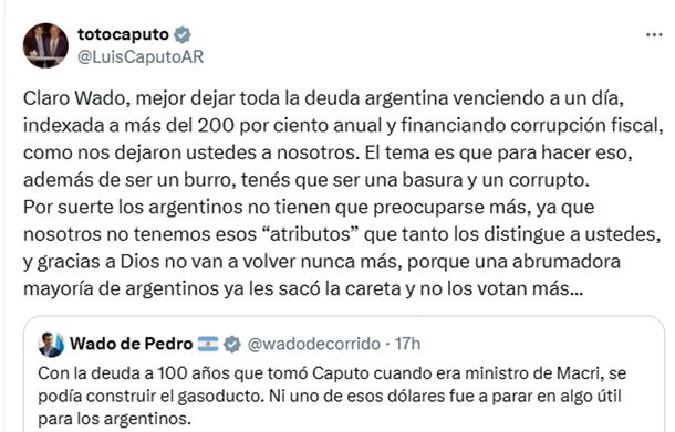 Esta vez fue Luis ‘Todo’ Caputo quien arremetió con furia propia de mejores causas contra Eduardo ‘Wado’ de Pedro, quien por el mismo medio había recordado la sideral deuda tomada por la gestión de Mauricio Macri, cuando el actual ministro de Economía llegó a fungir como ministro de Finanzas y titular del Banco Central (BCRA).