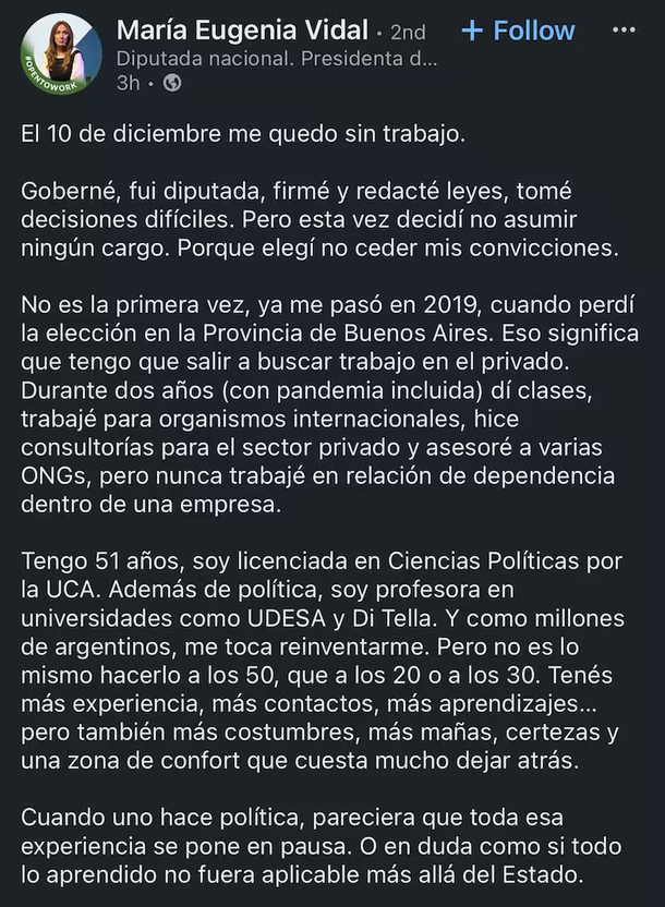 En su mensaje, Vidal enumeró aprendizajes de su carrera pública: la importancia de armar equipos sólidos más allá de las individualidades, la necesidad de dar la cara cuando las cosas no salen como se esperan y la relevancia de contar con un método para implementar ideas. También pidió recomendaciones a la comunidad de Linkedin para poder encarar su búsqueda laboral.