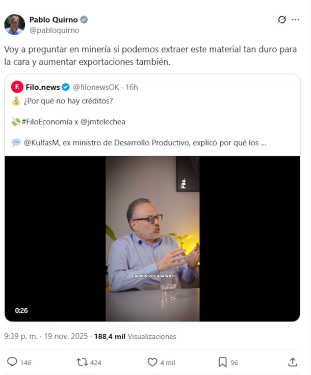 Esa intervención fue citada por Quirno, quien respondió con una ironía que encendió la disputa: “Voy a preguntar en minería si podemos extraer este material tan duro para la cara y aumentar exportaciones también”. El tono irónico generó una inmediata respuesta de Kulfas, quien replicó: “¿En qué andará el Canciller argentino?”, reforzando la chicana con otra frase: “El canciller argentino seguramente estará trabajando en los detalles acuerdo con EE.UU. defendiendo los intereses nacionales”.