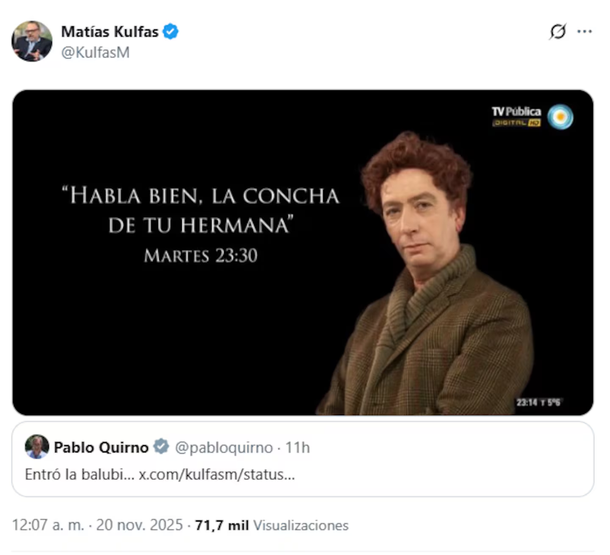 El ida y vuelta no se detuvo allí: Quirno devolvió la ironía con “Entró la balubi…”, una expresión viral en redes. La discusión sumó un nuevo capítulo cuando Felipe Núñez, integrante del equipo del ministro Luis Caputo, intervino para cuestionar la velocidad con la que Kulfas respondió a los posteos: “Hiciste dos tuits iguales en dos minutos, Matías. Te hiperinflacionás más rápido que el peso argentino cuando gobiernan ustedes”.