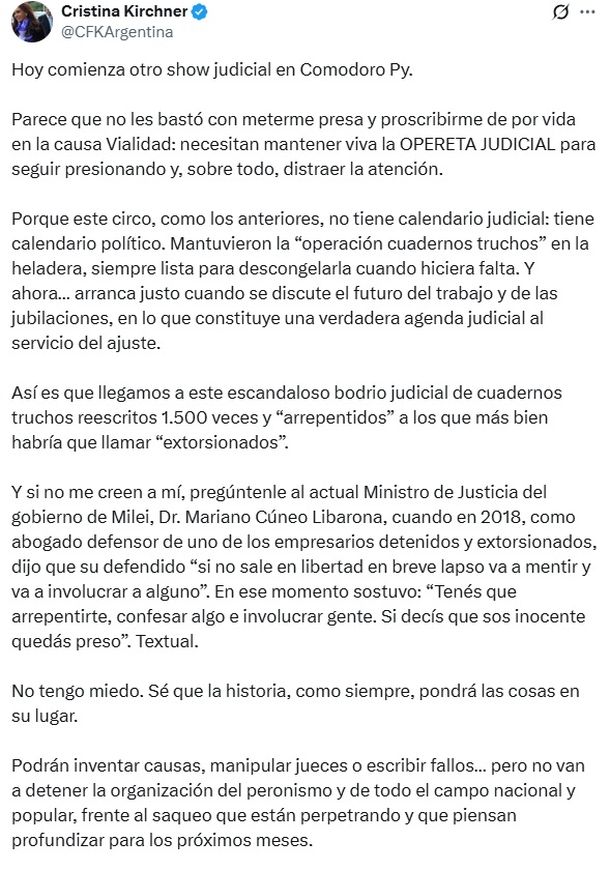 "Hoy comienza otro show judicial en Comodoro Py. Parece que no les bastó con meterme presa y proscribirme de por vida en la causa Vialidad: necesitan mantener viva la OPERETA JUDICIAL para seguir presionando y, sobre todo, distraer la atención", dijo Cristina Kirchner.