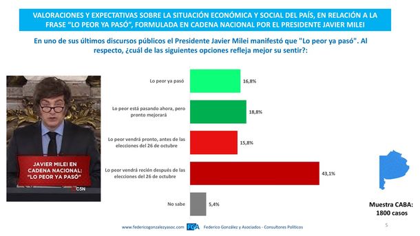 Además de medir intención de voto, el trabajo indagó en percepciones sobre la coyuntura económica. Frente a la afirmación de Milei en cadena nacional, “Lo peor ya pasó”, 6 de cada 10 argentinos aseguró que lo peor todavía está por venir.