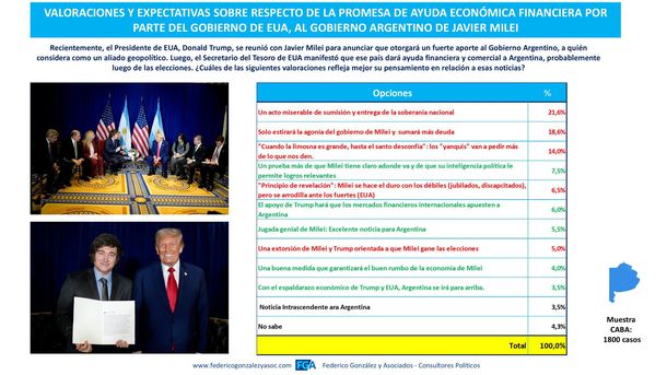 Un 21,6% de los argentinos aseguró que la visita de Milei a Trump fue “un acto miserable de sumisión y entrega de la soberanía nacional”. El 18,6% dijo que el salvataje de la Casa Blanca “sólo estirará la agonía del gobierno y sumará más deuda”, mientras que el 14% aseguró que “los "yanquis van a pedir más de lo que nos den”.