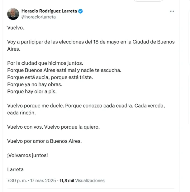 En este sentido, el exgobernador porteño ya había publicado un picante tuit al respecto y decidió seguir por ese camino. "Vuelvo", dijo Larreta en el comienzo del escueto mensaje, y sentenció: "Porque Buenos Aires está mal y nadie te escucha. Porque está sucia, porque está triste. Porque ya no hay obras. Porque hay olor a pis".