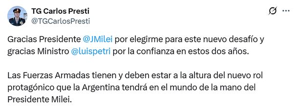 Para ello utilizó las redes sociales, específicamente X, donde escribió: “Gracias Presidente Javier Milei por elegirme para este nuevo desafío y gracias Ministro Luis Petri por la confianza en estos dos años”.