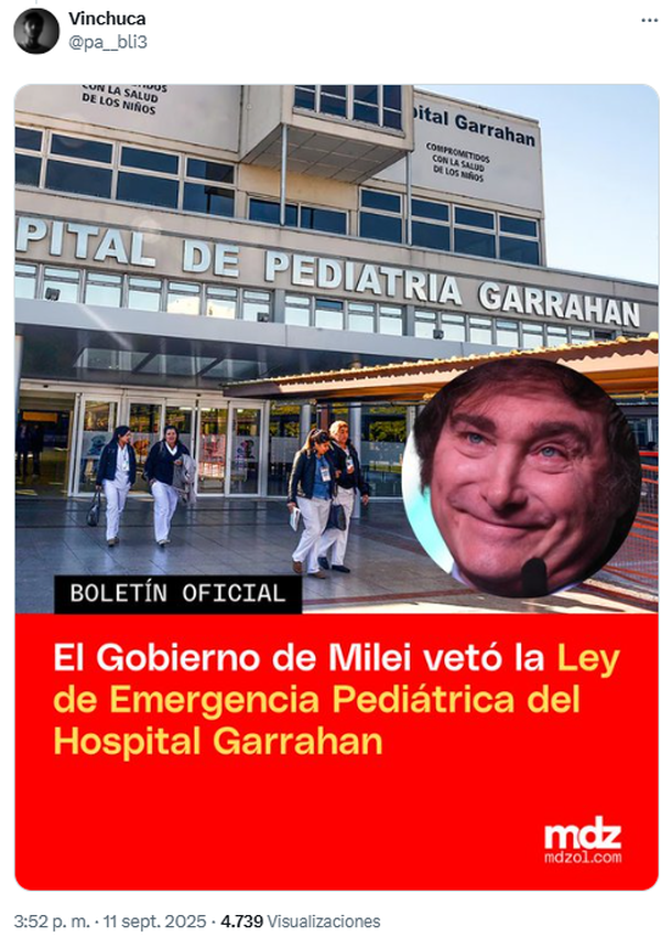 Además, entre las principales reacciones y respuestas, los usuarios de X no dudaron en recordarle al libertario que su Gobierno acaba de vetar la emergencia pediátrica, es decir, la norma que protegía al Hospital Garrahan -centro infantil- y a sus trabajadores.