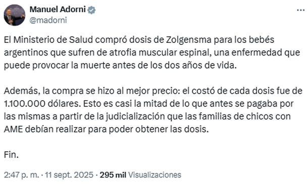 Y agregó: "Además, la compra se hizo al mejor precio: el costo de cada dosis fue de 1.100.000 dólares. Esto es casi la mitad de lo que antes se pagaba por las mismas a partir de la judicialización que las familias de chicos con AME debían realizar para poder obtener las dosis. Fin".