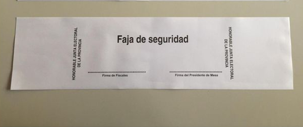 La urna también tiene que contar con una faja de seguridad ancha que atraviese todo el lado superior y que se entrega junto con el resto de los elementos necesarios para llevar a cabo la elección. La faja debe estar firmada por las autoridades de mesa y los fiscales, y una vez cerrada no puede ser abierta.