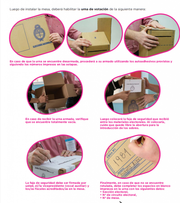 Además, como se explica en este instructivo de la Cámara Nacional Electoral, en los casos en que la urna se entrega armada el presidente de mesa debe revisarla para verificar que no quede ningún elemento adentro. Luego, se debe colocar la faja de seguridad ancha.