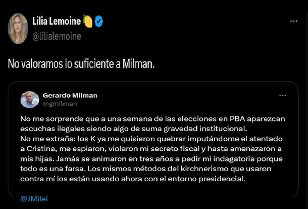 Lilia Lemoine salió a respaldar a su par del PRO Gerardo Milman, quien apuntó contra el kirchnerismo por la aparición de audios atribuidos a la secretaria general de la Presidencia, Karina Milei.