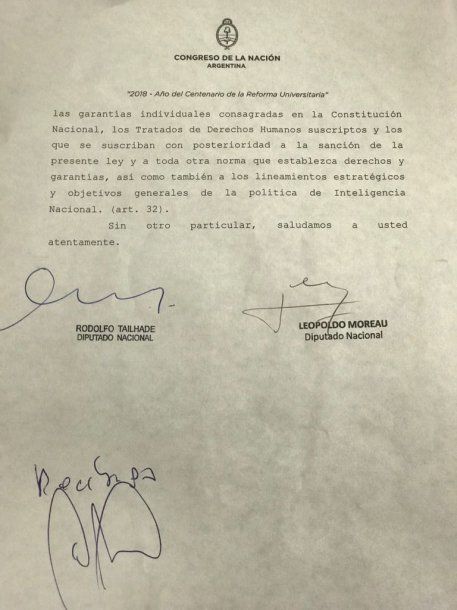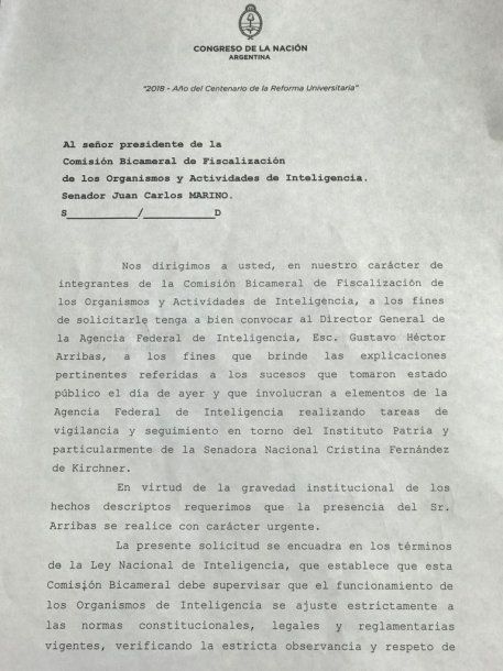 Los diputados nacionales Leopoldo Moreau y Rodolfo Tailhade, integrantes de la Comisión Bicameral de Fiscalización de los Organismos y Actividades de Inteligencia, solicitaron al titular de dicha comisión, el senador Juan Carlos Marino, que cite al jefe de la Agencia Federal de Inteligencia, Gustavo Arribas.