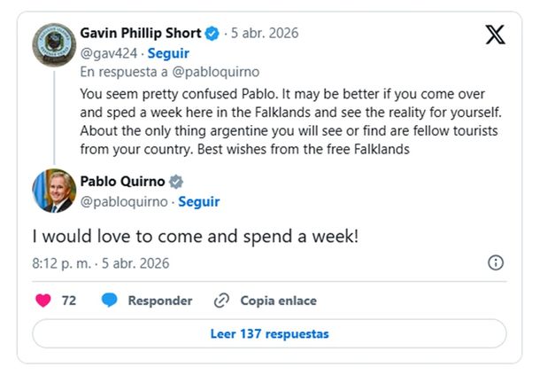 El posteo suscitó una serie de reacciones, entre ellas de cuentas vinculadas a la administración colonial de las Malvinas. Gavin Phillip Short, ex integrante de la Asamblea Legislativa de las Islas Malvinas le contestó en inglés: "Pablo, parecés bastante confundido. Quizás sería mejor que vinieras y pasaras una semana aquí en las Malvinas para que vieras la realidad por ti mismo. Lo único argentino que verás o encontrarás serán otros turistas de tu país. Saludos desde las Malvinas libres".