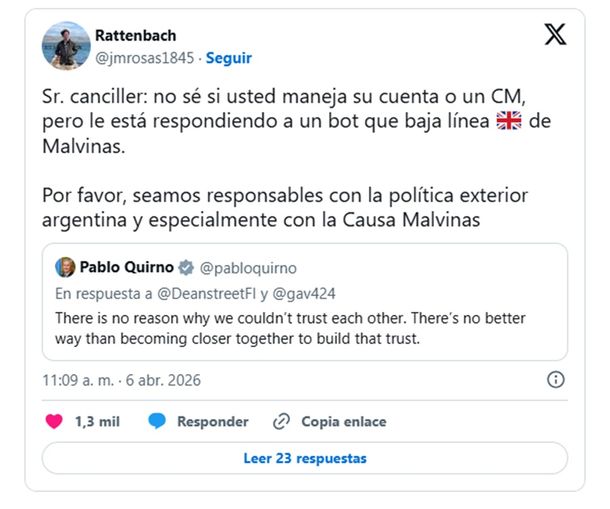 Asimismo, cita al abogado especialista en Malvinas Juan Rattenbach, quien también criticó la performance del ministro argentino. Citando los tuits, afirmó: “Sr. canciller: no sé si usted maneja su cuenta o un CM, pero le está respondiendo a un bot que baja línea de Malvinas. Por favor, seamos responsables con la política exterior argentina y especialmente con la Causa Malvinas”.