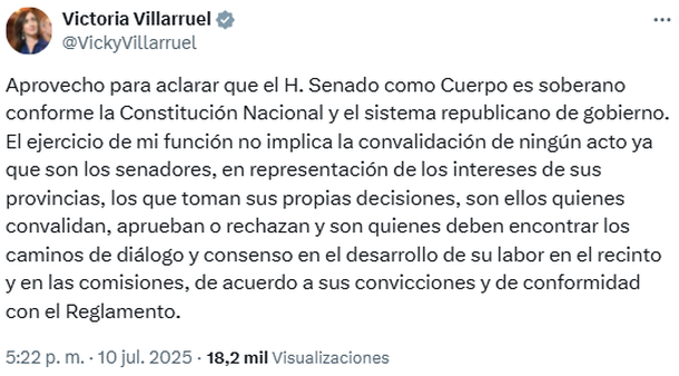 En un segundo mensaje, dejó un contundente mensaje a Bullrich y a todo el Gobierno: "Aprovecho para aclarar que el H. Senado como Cuerpo es soberano conforme la Constitución Nacional y el sistema republicano de gobierno".