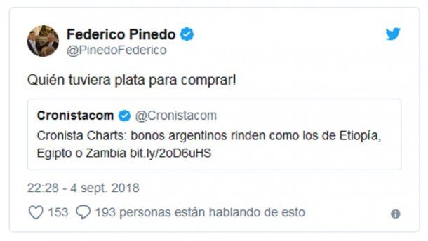 El presidente provisional del Senado, Federico Pinedo, publicó este martes un tuit con el mensaje "Quién tuviera plata para comprar!" (SIC) junto al link a un artículo de un diario económico que asegura que los bonos argentinos rinden como los de Etiopía, Egipto o Zambia.