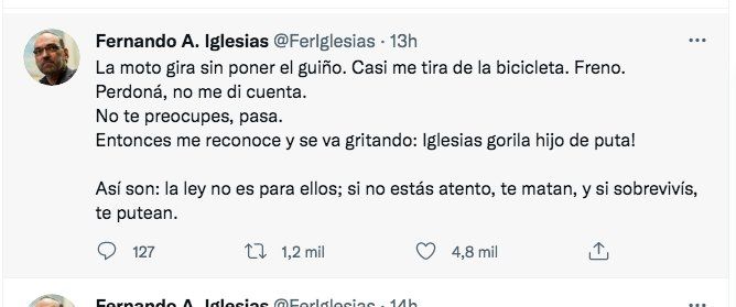 Pero la cuestión no terminó ahí, por el motociclista primero le pidió disculpas por una presunta mala maniobra, pero al reconocerlo lo insultó: "Iglesias gorila hijo de puta".