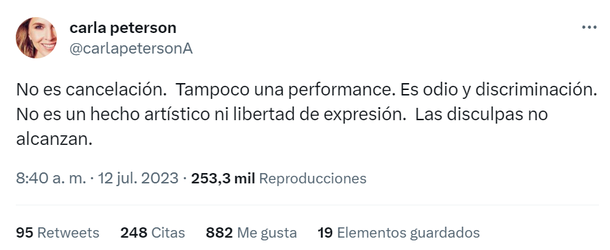 "No es cancelación. Tampoco una performance. Es odio y discriminación. No es un hecho artístico ni libertad de expresión. Las disculpas no alcanzan", escribió en sus redes sociales Peterson, a quién los discriminadores de Juntos por el Cambio le tirarán por la cabeza que es la esposa de un rival del xenófobo Rinaldi.