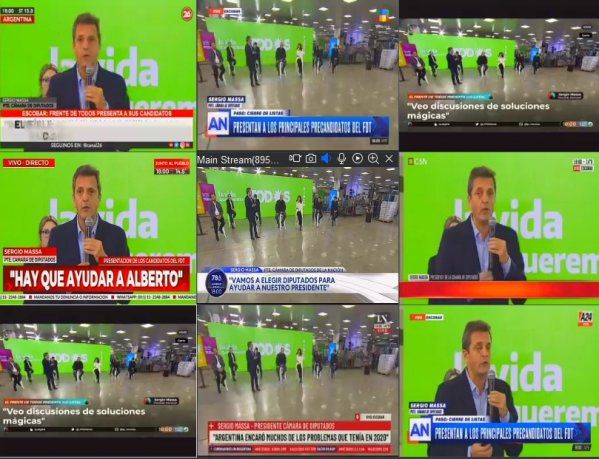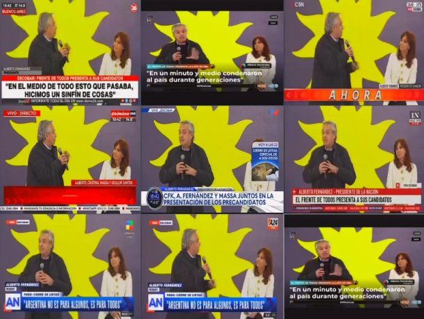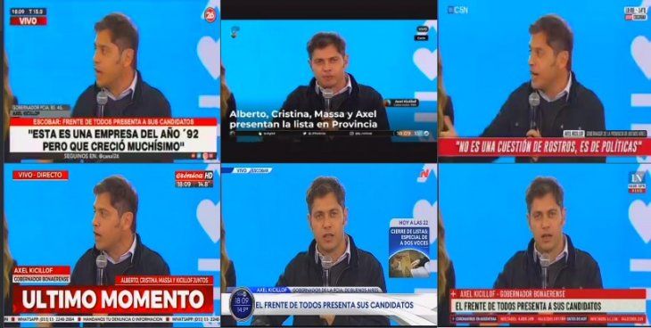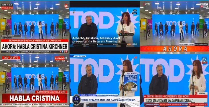 Todos y cada uno de los canales de televisión y cadenas difunden el acto que se lleva a cabo en Escobar, donde se presentan los precandidatos del FdT por la provincia y la Ciudad de Buenos Aires.