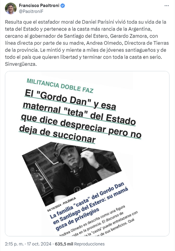 "Resulta que el estafador moral de Daniel Parisini vivió toda su vida de la teta del Estado y pertenece a la casta más rancia de la Argentina, cercano al gobernador de Santiago del Estero, Gerardo Zamora, con línea directa por parte de su madre, Andrea Olmedo, Directora de Tierras de la provincia", disparó el legislador formoseño a través de su cuenta de X ayer por la tarde.