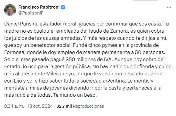 Lejos de calmarse, el cruce continuó este viernes a la mañana cuando Paoltrini respondió: “Daniel Parisini, estafador moral, gracias por confirmar que sos casta. Tu madre no es cualquier empleada del feudo de Zamora, es quien cobra los juicios de las causas armadas”.