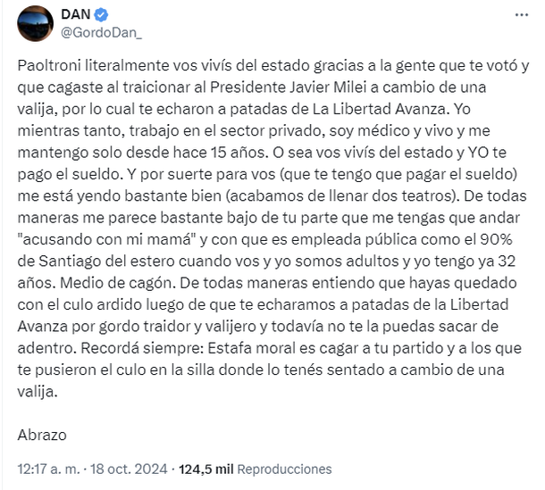 Ante esto, el influencer y streamer no se quedó atrás y lanzó: “Paoltroni literalmente vos vivís del estado gracias a la gente que te votó y que cagaste al traicionar al Presidente Javier Milei a cambio de una valija, por lo cual te echaron a patadas de La Libertad Avanza. Yo mientras tanto, trabajo en el sector privado, soy médico y vivo y me mantengo solo desde hace 15 años. O sea vos vivís del estado y YO te pago el sueldo”.