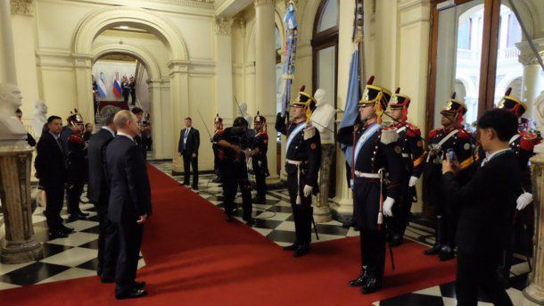 Putin llegó a la casa de Gobierno pasadas las 19.15 en medio de un fuerte operativo de seguridad tras recorrer con su caravana las avenidas Del Libertador y Leandro N. Alem. Fue recibido por Macri y los Granaderos en la puerta norte.