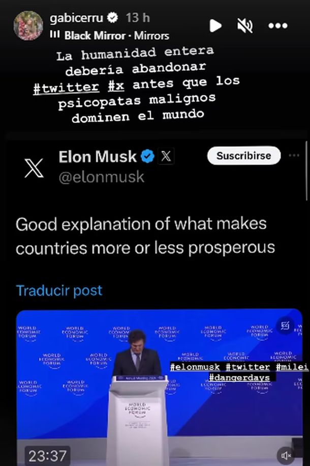 Por otro lado, compartió una historia en Instagram con el mensaje de Elon Musk elogiando al presidente Milei y propuso: “La humanidad entera debería abandonar #Twitter #X antes que los psicópatas malignos dominen el mundo”.