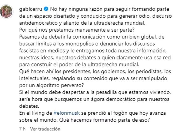 "Nos leeremos en algún otro espacio", agregó y continuó con su reflexión en su cuenta de Instagram: “No hay ninguna razón para seguir formando parte de un espacio diseñado y conducido para generar odio, discurso antidemocrático y aliento de la ultraderecha mundial”, opinó.