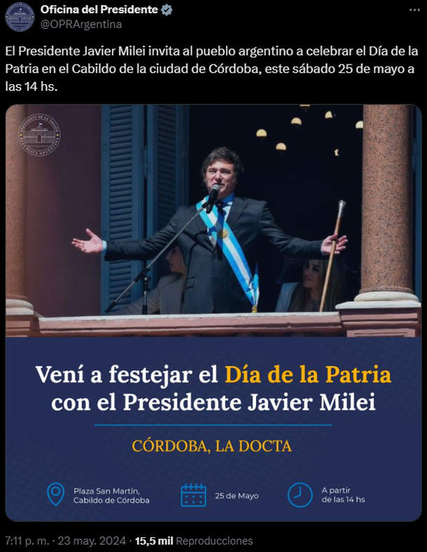 En la tarde de este jueves, la cuenta oficial de la Oficina del Presidente en la red social X lanzó una invitación a todos los ciudadanos para celebrar el 25 de mayo. De esta manera, indicaron que el presidente Javier Milei estará presente en Córdoba para el Día de la Patria.