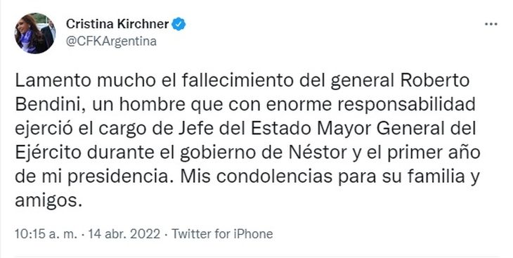 "Lamento mucho el fallecimiento del general Roberto Bendini, un hombre que con enorme responsabilidad ejerció el cargo de Jefe del Estado Mayor General del Ejército durante el Gobierno de Néstor y el primer año de mi Presidencia. Mis condolencias para su familia y amigos", escribió la Vicepresidenta en su cuenta de Twitter.