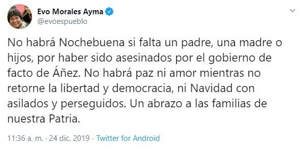 Además, en otro tuit Morales se refirió directamente a la presidenta de facto y sostuvo que “no habrá Nochebuena si falta un padre, una madre o hijos, por haber sido asesinados por el gobierno de facto de Añez. No habrá paz ni amor mientras no retorne la libertad y democracia, ni Navidad con asilados y perseguidos. Un abrazo a las familias de nuestra Patria”.