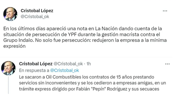"No solo fue persecución: redujeron la empresa a la mínima expresión. Le sacaron a Oil Combustibles los contratos de 15 años prestando servicios sin inconvenientes y se los cedieron a empresas amigas, en un trámite express dirigido por Fabián 'Pepín' Rodríguez y sus secuaces", denunció López a través de su cuenta de Twitter.