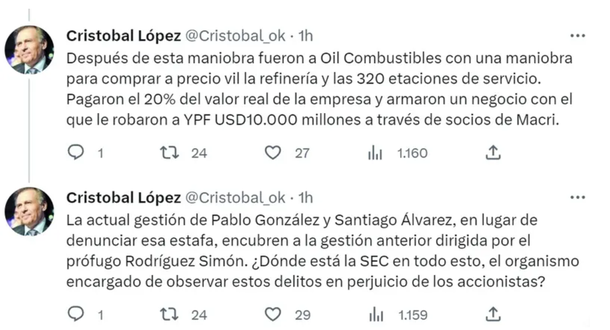 López expuso también a Pablo González y Santiago Álvarez, presidente y vice de YPF, respectivamente. "En lugar de denunciar esa estafa, encubren a la gestión anterior dirigida por el prófugo Rodríguez Simón".