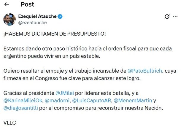 Ezequiel Atauche, senador nacional de Jujuy por La Liberta Avanza, dio el anuncio cera de la 1 del mediodía: ¡Habemus dictamen de presupuesto! Estamos dando otro paso histórico hacia el orden fiscal para que cada argentino pueda vivir en un país estable”, publicó en su cuenta de la red social X.