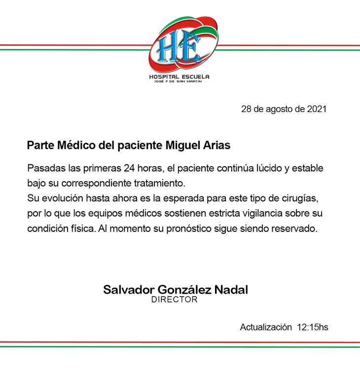 El Hospital Escuela José Francisco de San Martín difundió este sábado un nuevo parte médico de Miguel Arias.