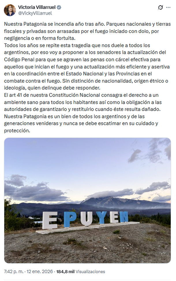 Villarruel indicó que decidió promover los cambios en la legislación debido a que “nuestra Patagonia se incendia año tras año”. “Parques nacionales y tierras fiscales y privadas son arrasadas por el fuego iniciado con dolo, por negligencia o en forma fortuita”, expuso y remarcó que “nuestra Patagonia es un bien de todos los argentinos y de las generaciones venideras y nunca se debe escatimar en su cuidado y protección”.