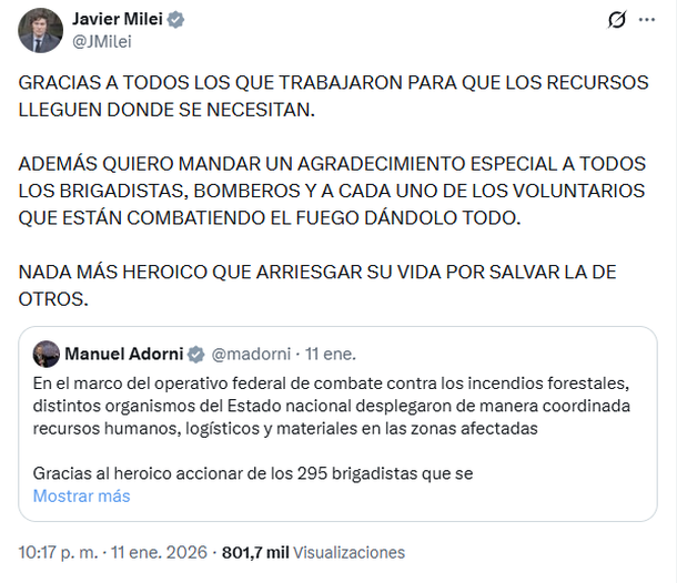 El presidente Javier Milei también se refirió a la problemática, pero centró su mensaje en agradecer a quienes forman parte del operativo de lucha contra los incendios: “Gracias a todos los que trabajaron para que los recursos lleguen donde se necesitan”, escribió también en X. Y agregó: “Quiero mandar un agradecimiento especial a todos los brigadistas, bomberos y a cada uno de los voluntarios que están combatiendo el fuego dándolo todo. Nada más heroico que arriesgar su vida por salvar la de otros”.