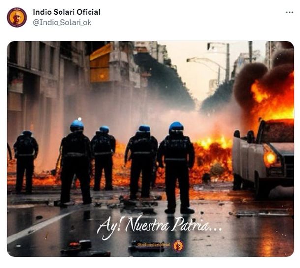 El músico Carlos "El Indio" Solari, ex líder del grupo Patricio Rey y sus Redonditos de Ricota, publicó este sábado una foto de una ciudad en llamas con la presencia de las fuerzas de seguridad que recuerda mucho al escenario de diciembre de 2001, tras el protocolo antipiquetes anunciado por Patricia Bullrich.