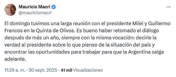 "El domingo tuvimos una larga reunión con el presidente Milei y Guillermo Francos en la Quinta de Olivos. Es bueno haber retomado el diálogo después de más un año, siempre con la misma vocación: decirle la verdad al presidente sobre lo que pienso de la situación del país y encontrar las oportunidades para trabajar para que la Argentina salga adelante”.